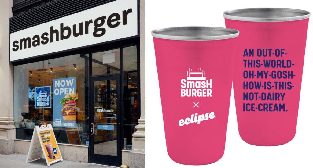 We built a custom step-and-repeat that married the Summer of Shakes party theme with Smashburger’s whimsical identity. This backdrop set the stage for blind taste tests conducted live on social media. Myriad influencers, customers and media shared their authentic reactions to the creamy taste and texture of Eclipse shakes, often finding them indistinguishable from traditional dairy shakes.